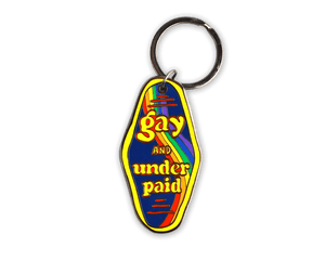 This bold 2.5” hard enamel keychain says what your direct deposit won’t: you’re gay, you’re fabulous, and you’re still wildly underpaid. Drenched in retro rainbow energy with bright yellow text and a coffin-shaped throwback motel key tag shape, it’s the perfect mix of protest and camp.
